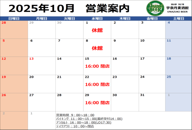 10月の営業日のご案内 2025/10/04 その他 いつもご利用ありがとうございます。 10月のレストラン営業日は 下記掲載カレンダー通りとなります。 宜しくお願い致します。 尚、売店は無休です。(月末最終日は、棚卸の為、短縮営業です。) この記事をシェアする